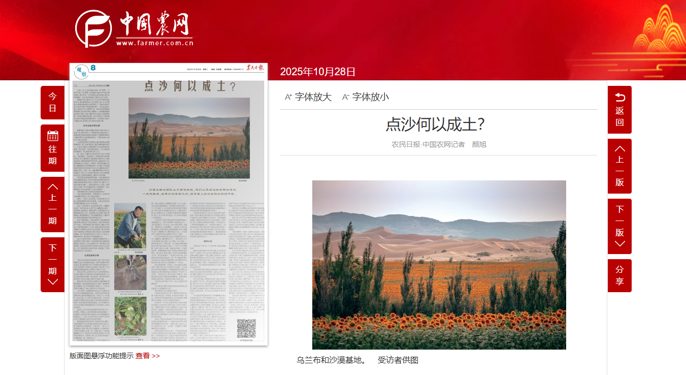 农民日报整版深度报道老伟德网上娱乐沙漠土壤化团队乌兰布和沙漠治理奇迹