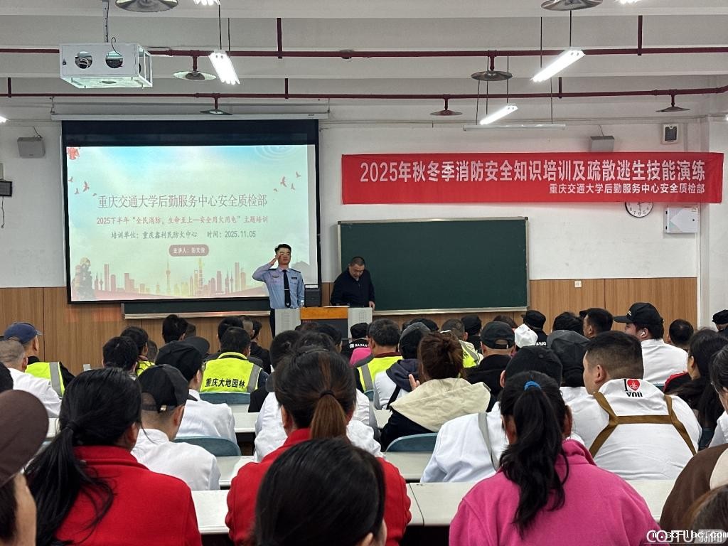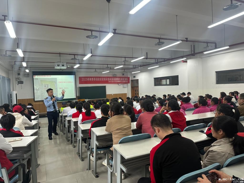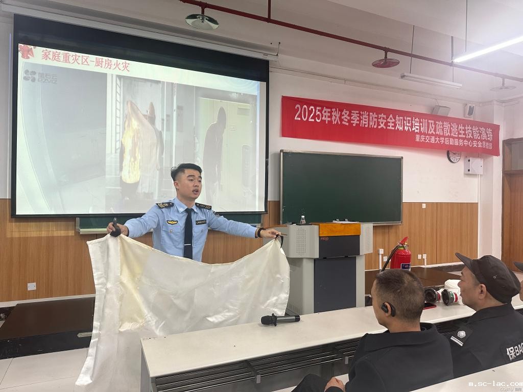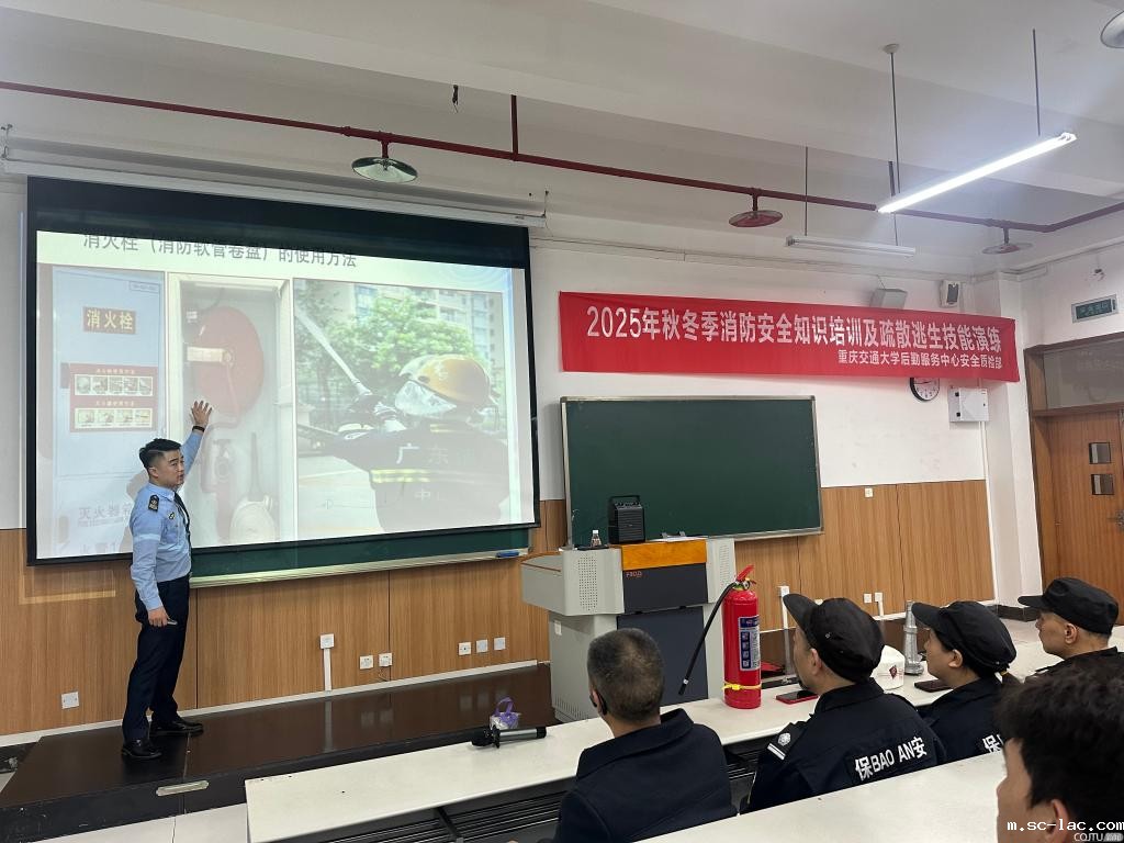 为深入贯彻市教委《关于进一步加强学校消防安全工作的通知》精神,结合11.9消防日来临之际,积极响应第34个全国消防月“全民消防,生命至上——安全用火用电”的号召,11月5日,后勤服务中心特邀重庆鑫利民防火宣传培训中心彭文俊教官,于南岸校区三教30304教室举办2025年秋冬季消防安全知识培训及疏散逃生技能演练。后勤物业、餐饮及校园各门面商户代表共约180人参与此次培训。活动采用“理论授课 + 实操演练 + 案例警示”的立体化模式,全面提升后勤员工消防安全应急处置能力,为校园消防安全筑牢坚实防线。