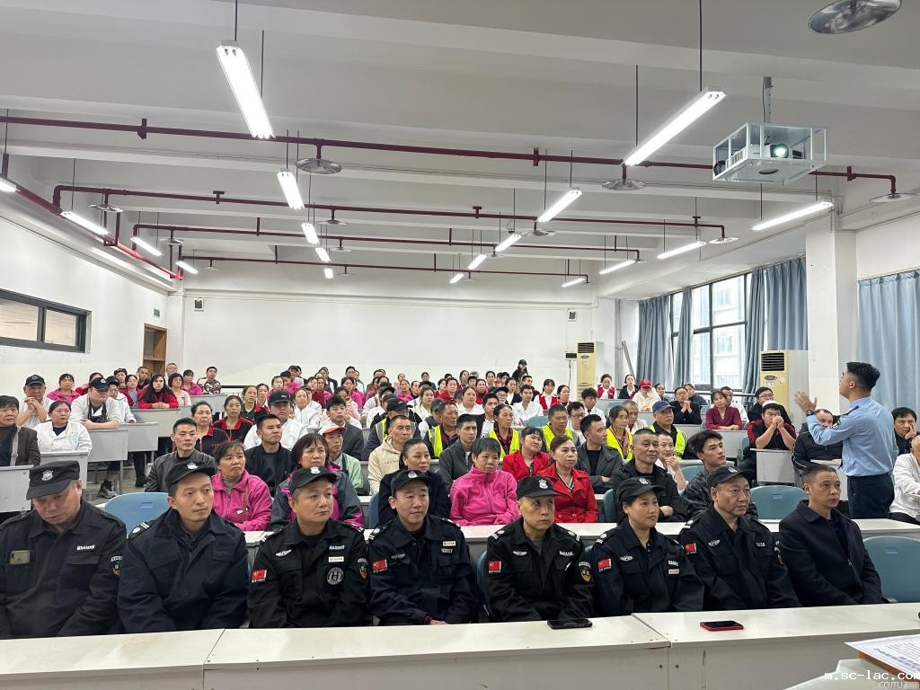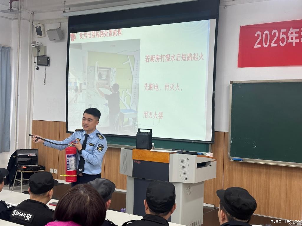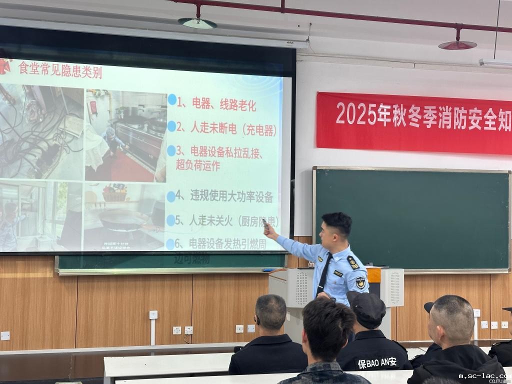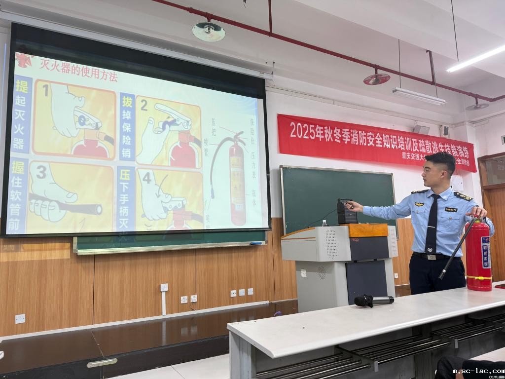 为深入贯彻市教委《关于进一步加强学校消防安全工作的通知》精神,结合11.9消防日来临之际,积极响应第34个全国消防月“全民消防,生命至上——安全用火用电”的号召,11月5日,后勤服务中心特邀重庆鑫利民防火宣传培训中心彭文俊教官,于南岸校区三教30304教室举办2025年秋冬季消防安全知识培训及疏散逃生技能演练。后勤物业、餐饮及校园各门面商户代表共约180人参与此次培训。活动采用“理论授课 + 实操演练 + 案例警示”的立体化模式,全面提升后勤员工消防安全应急处置能力,为校园消防安全筑牢坚实防线。
