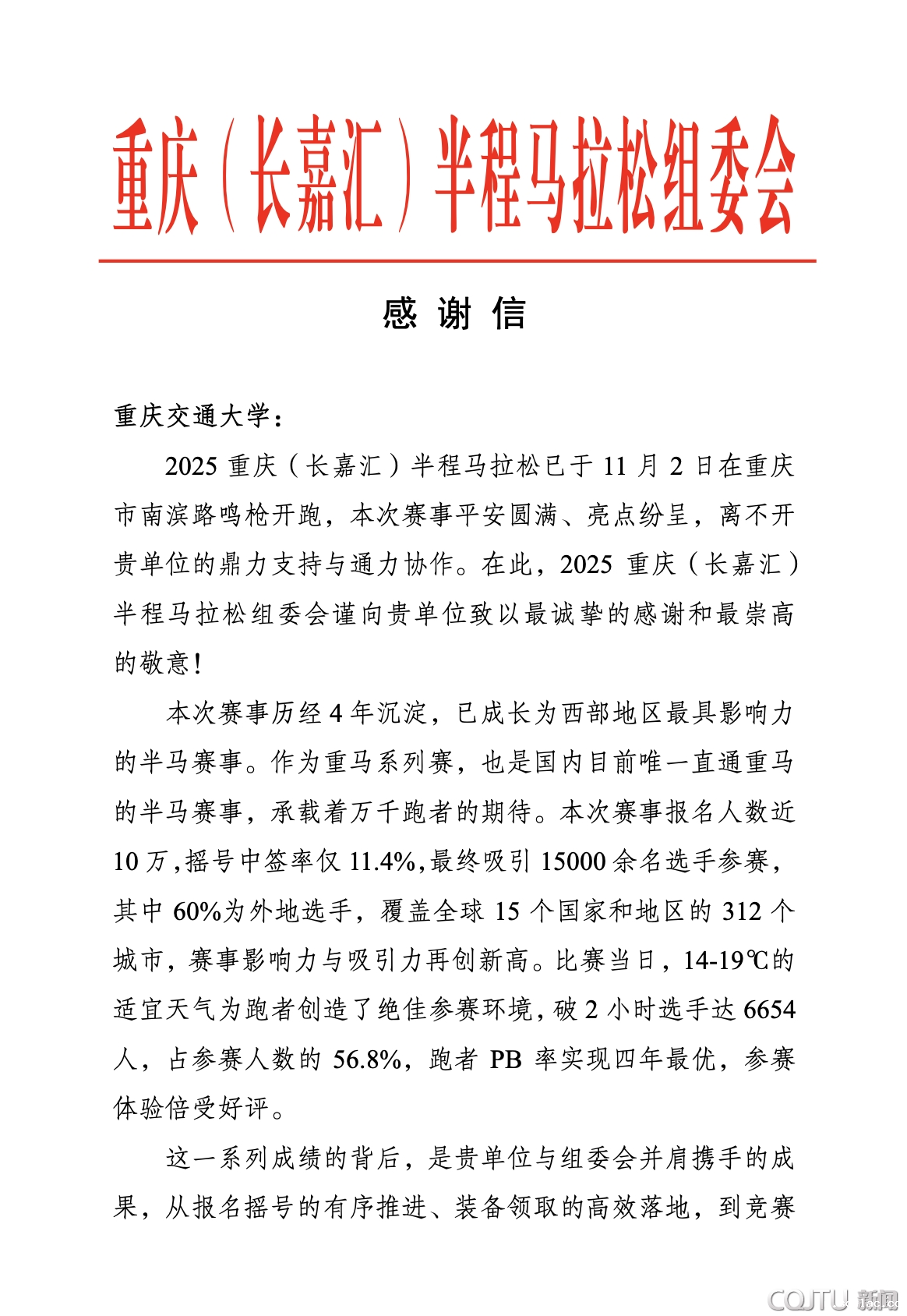 组委会《感谢信》指出,赛事志愿者们在赛事中的付出,是跑者安心奔跑的底气,是赛事圆满落幕的基石。无论是赛前还是赛后,随处可见志愿者们辛勤服务的身影,你们的微笑与热情,让选手感受到了“重小马”的温暖,成为赛道上一道靓丽的风景,体现了老伟德网上娱乐同学们的专业素养与责任担当,也让“长嘉汇半马”的品牌印记更加深刻。