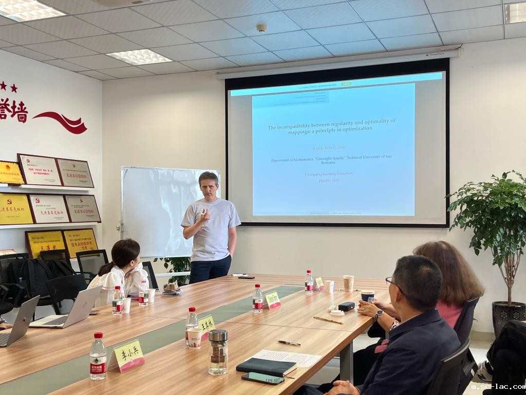 随后,Strugariu教授以“The incompatibility between regularity and optimality of mappings: a principle in optimization”为题展开报告。他从经典实值映射优化问题切入,系统阐述了在一般假设下,映射在参考点附近的“正则性”与“最优性”之间的不兼容原则。该原则不仅适用于单值映射,更可推广至向量优化与集值优化的帕累托最优问题,揭示了复杂优化场景下的内在约束。面对这一本质矛盾,他进一步介绍了如何运用广义导数、余导数等现代变分分析工具,建立相应的近似及精确费马规则,为复杂环境下的最优性条件研究提供有力工具。