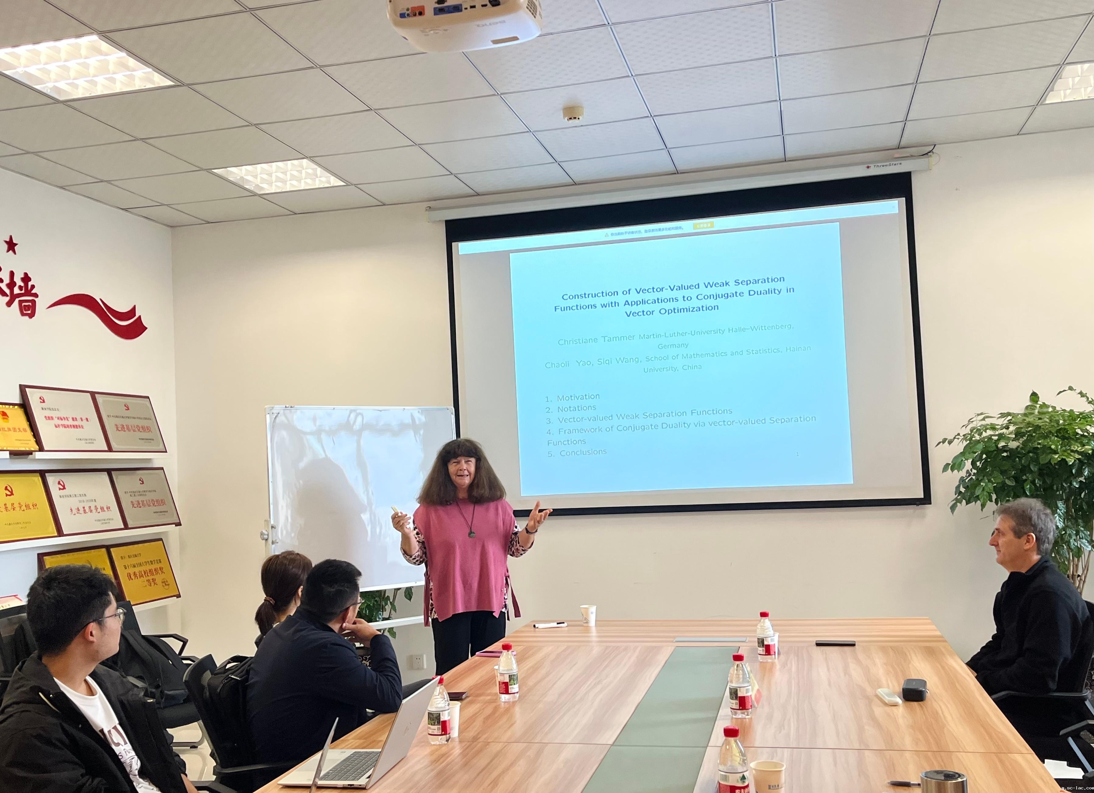 Tammer教授首先作了题为“Construction of vector-valued weak separation functions with applications to conjugate duality in vector optimization”的学术报告。她指出,传统多目标优化因依赖标量化处理,难以保全问题的内在结构信息。为突破此局限,她引入了“向量值弱分离函数”这一核心工具,使其能直接在像空间中判别向量最优性,进而构建出一个不依赖标量化的统一共轭对偶框架。Tammer教授进一步阐释了基于扰动映射与集值共轭的对偶问题构造方法,并借助向量意义的次微分、分离性等现代分析工具,深入论证了零对偶间隙与强对偶性等核心性质。