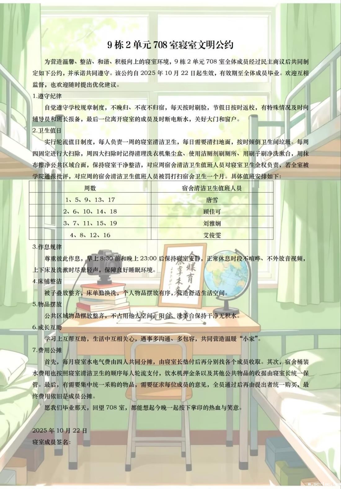 在这份公约中,卫生值日、费用公摊、奖惩机制都有明确的规定。这份详尽、民主又充满温情的公约,正是“室”界因你而不同的最好证明!