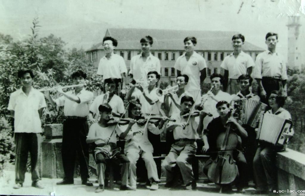 60年代校园乐队的合影,背后就是红砖楼和水塔